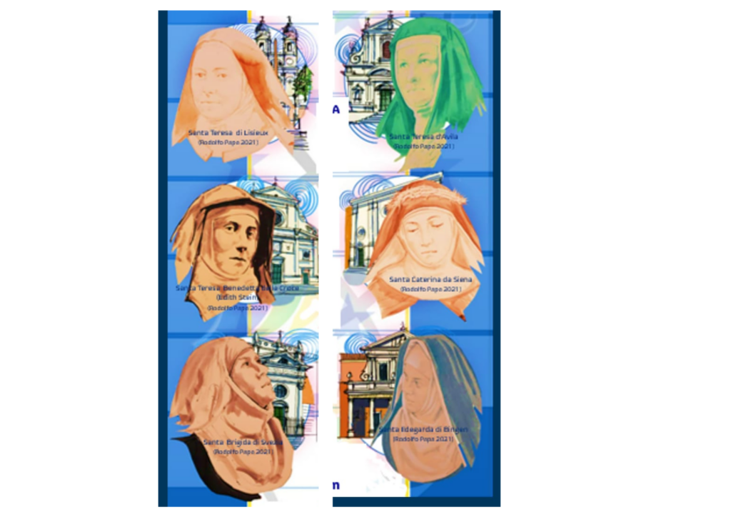 Avec sainte Thérèse de Lisieux, sainte Thérèse Bénedicte de la Croix, sainte Catherine de Sienne, sainte Brigitte, sainte Hildegarde, sainte Thérèse d’Avila.